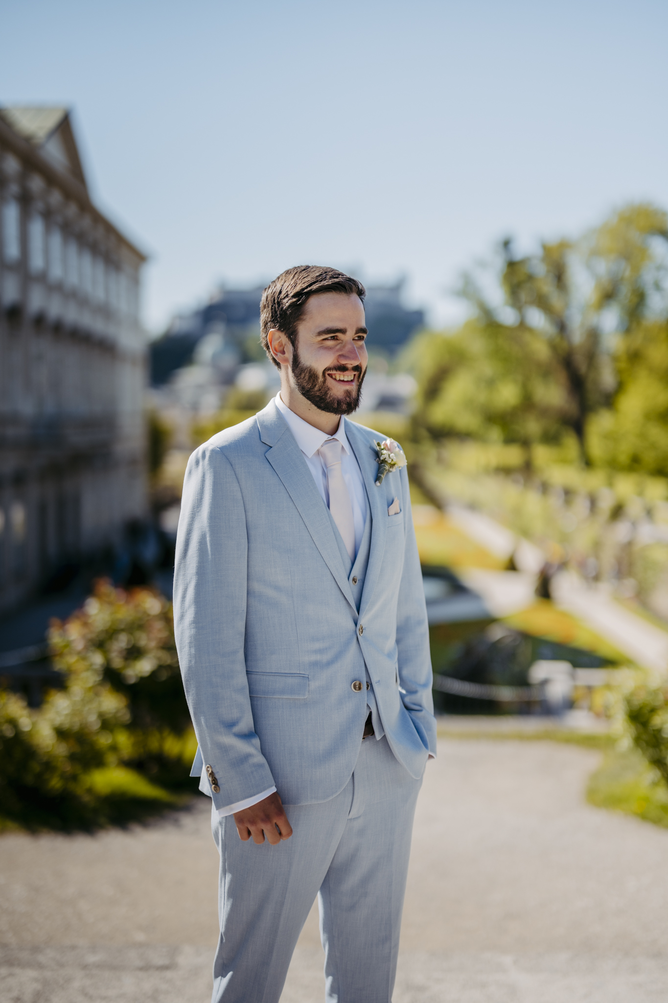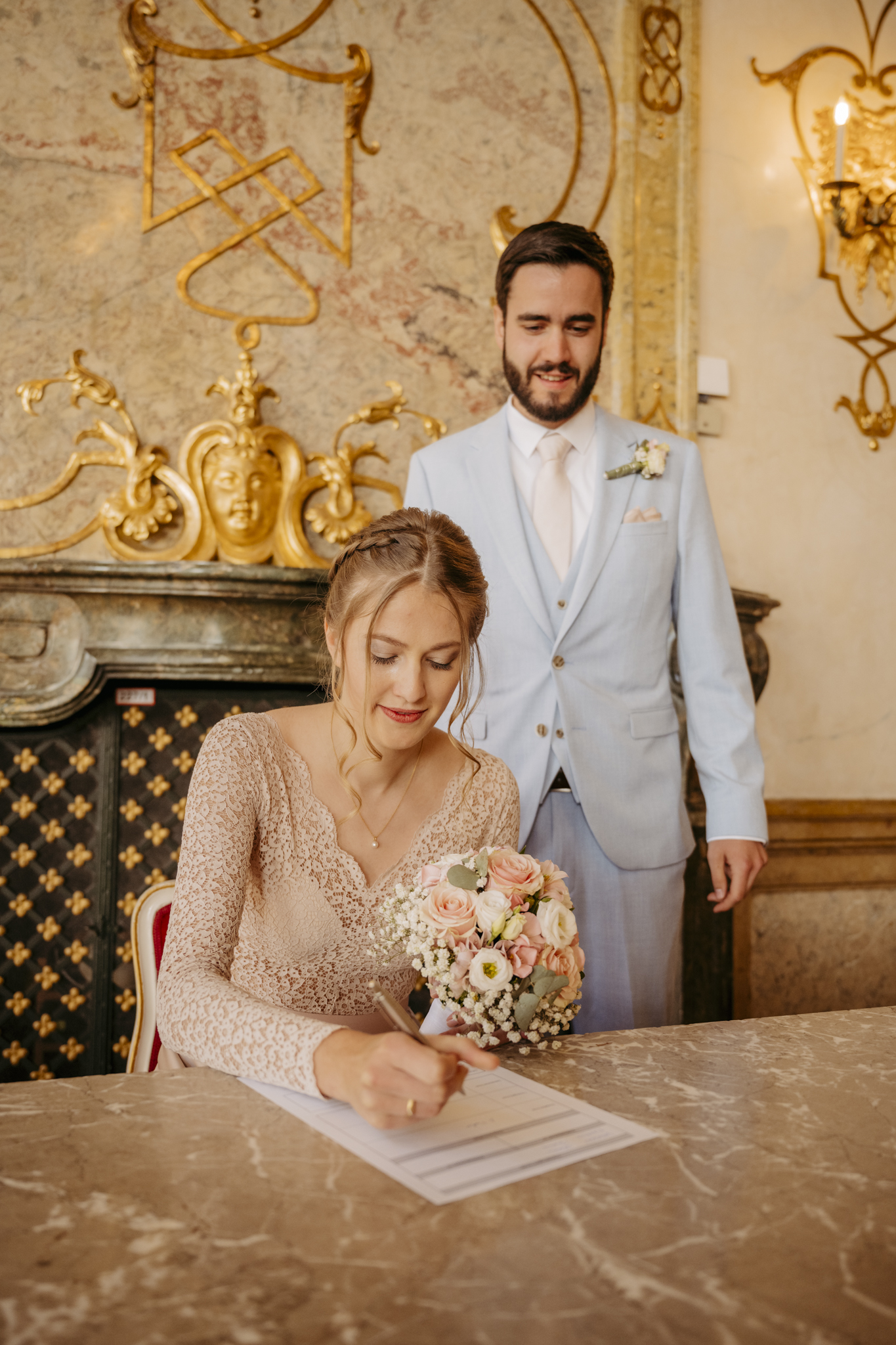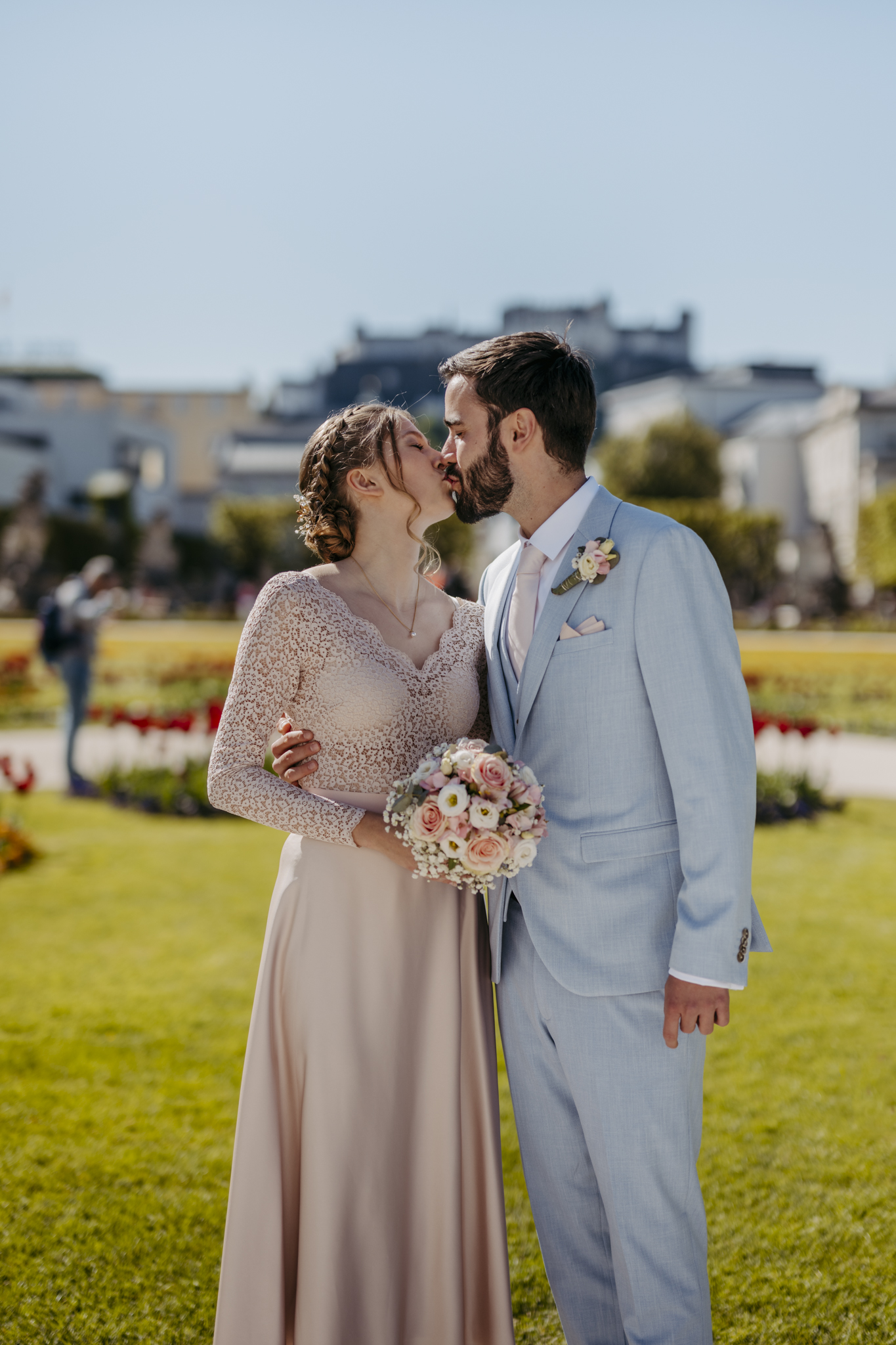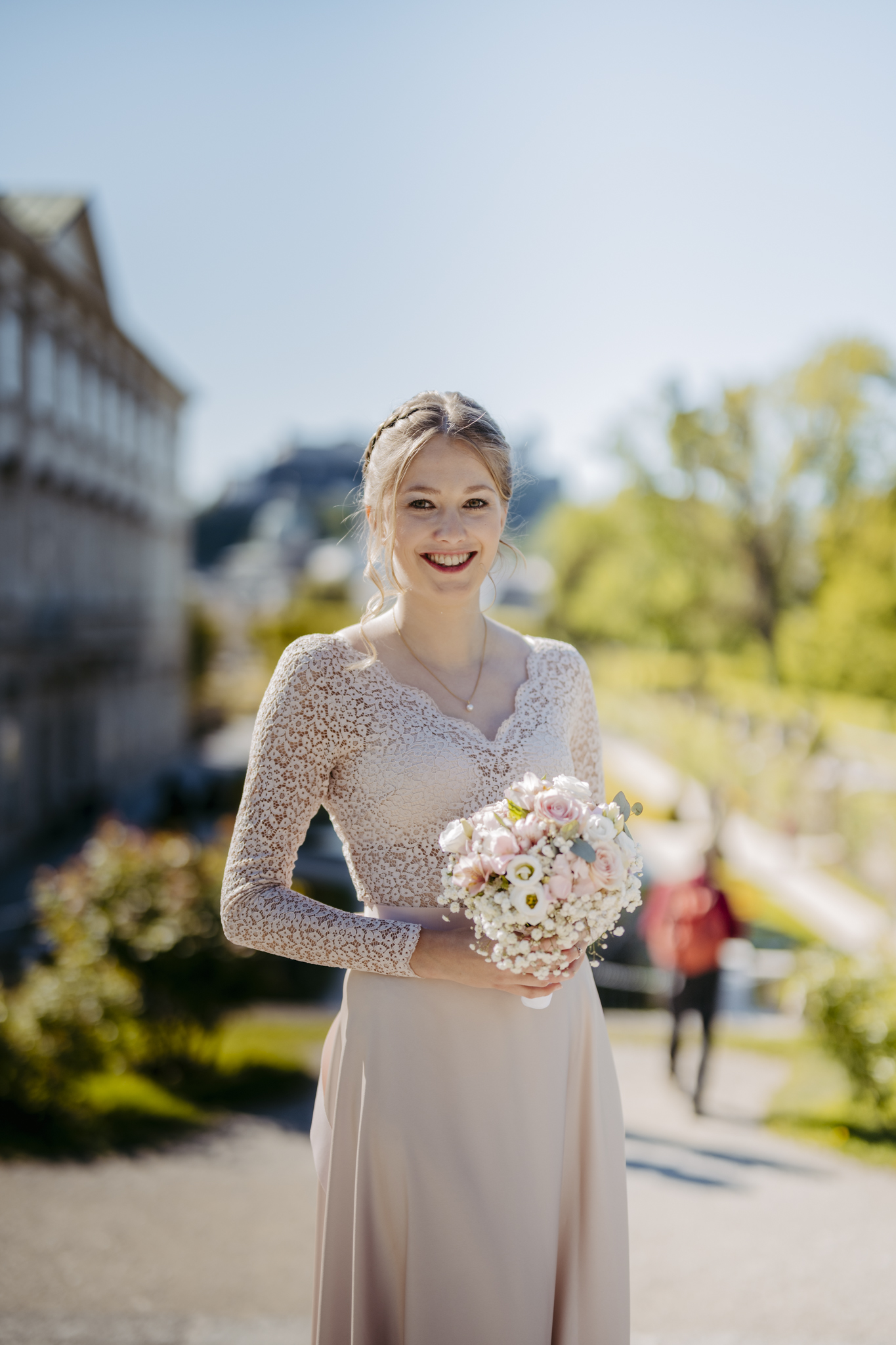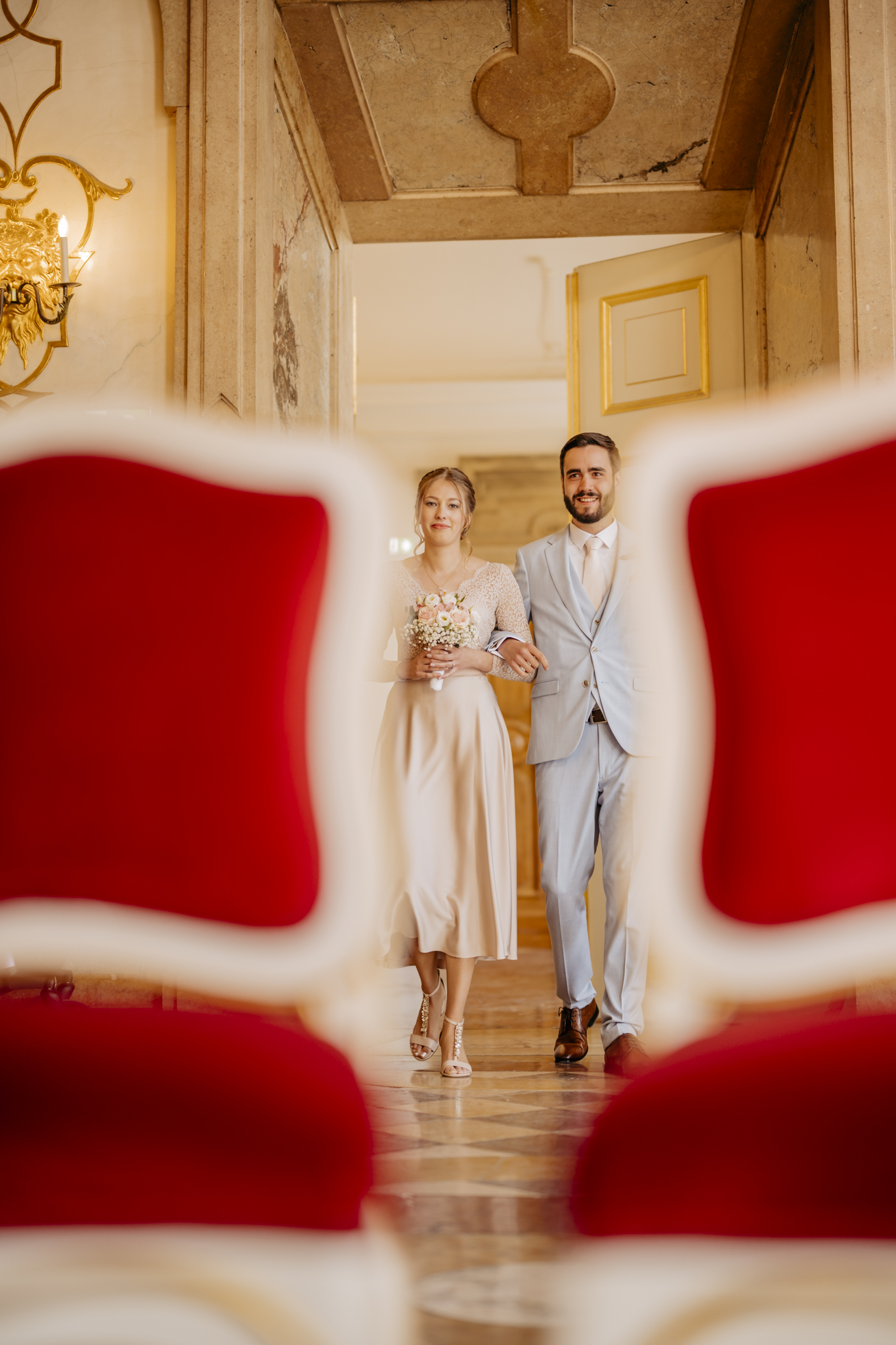 Das Schloss Mirabell mit seinem beeindruckenden Marmorsaal ist nicht nur ein Wahrzeichen von Salzburg, sondern auch ein Ort, der Romantik und Geschichte auf einzigartige Weise vereint. Die barocke Architektur, die kunstvollen Stuckaturen und die majestätische Atmosphäre boten Anna und Martin die perfekte Kulisse für ihre Trauung.
