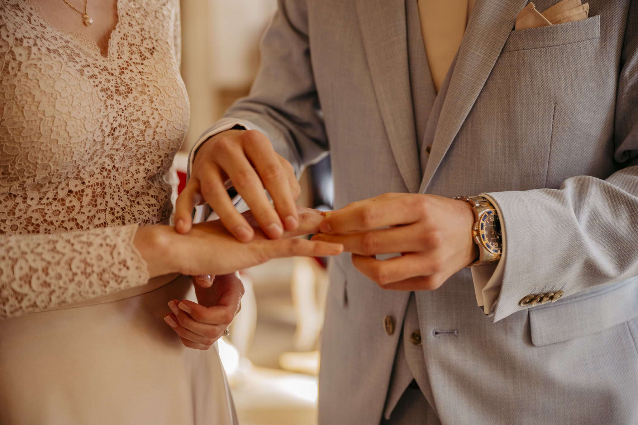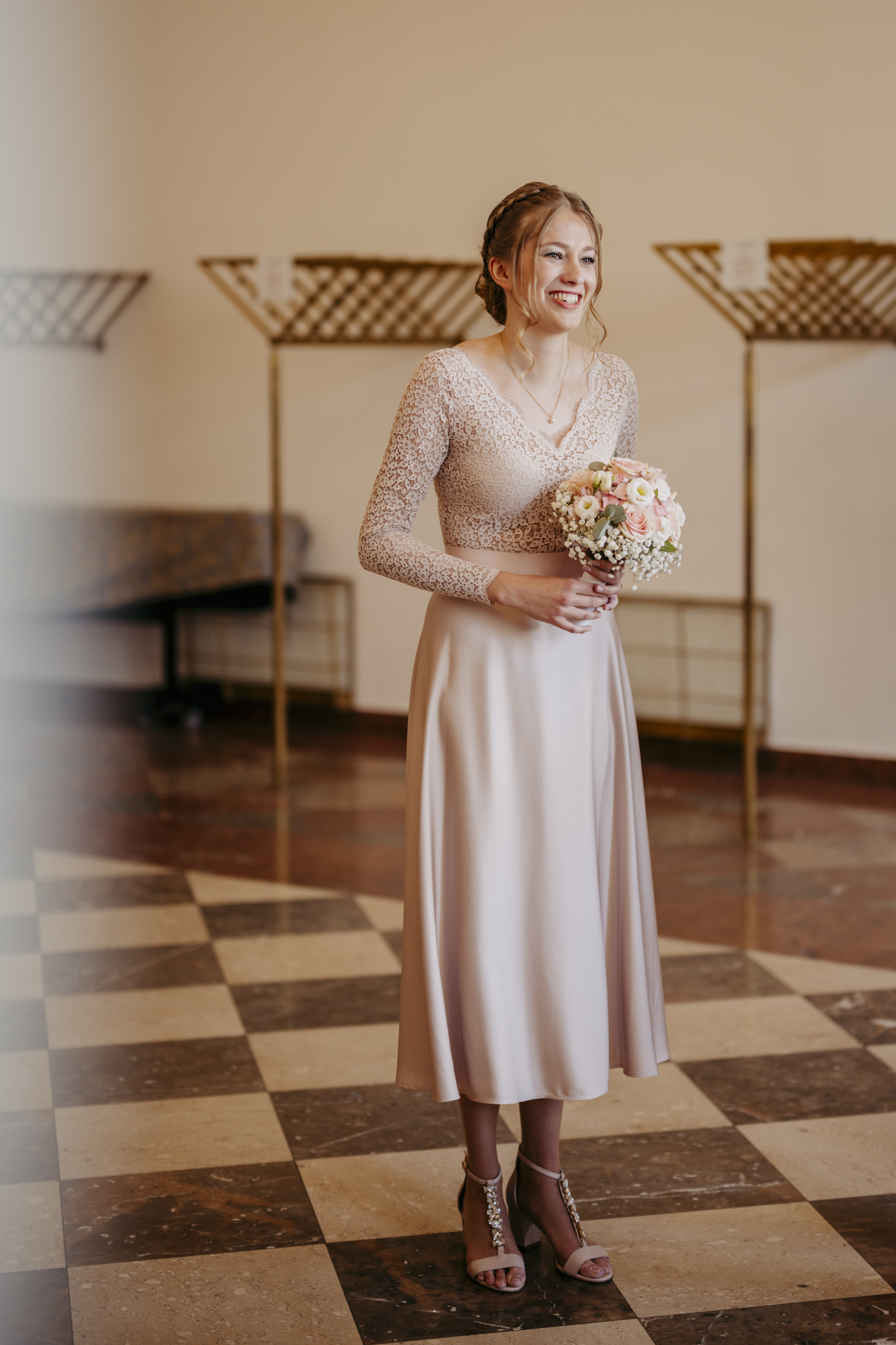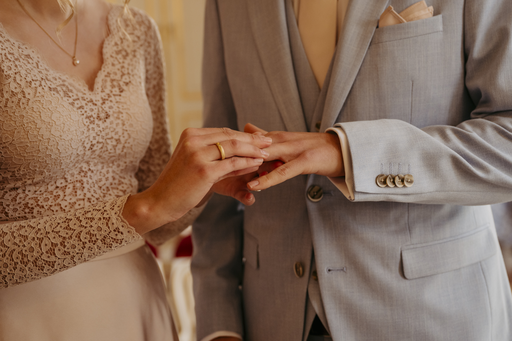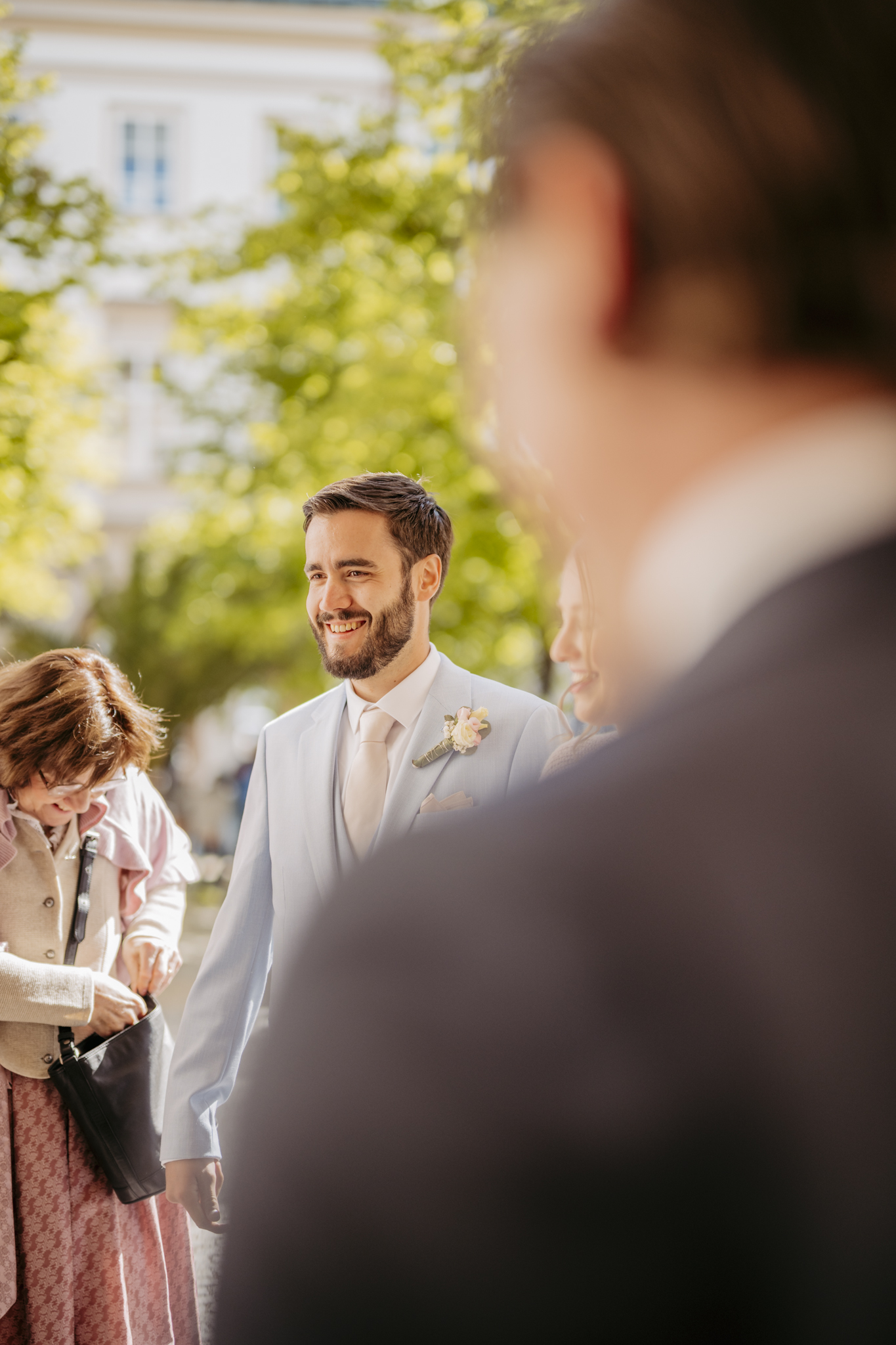 Um 9:30 Uhr begann die Zeremonie, begleitet von den warmen Sonnenstrahlen des Frühlingsmorgens. Anna, in einem bezaubernden Brautkleid, und Martin, in einem stilvollen Anzug, wurden von ihrer Familie und engsten Freunden aus Augsburg begleitet. Gemeinsam feierten sie diesen besonderen Moment in einer intimen, herzlichen Atmosphäre.