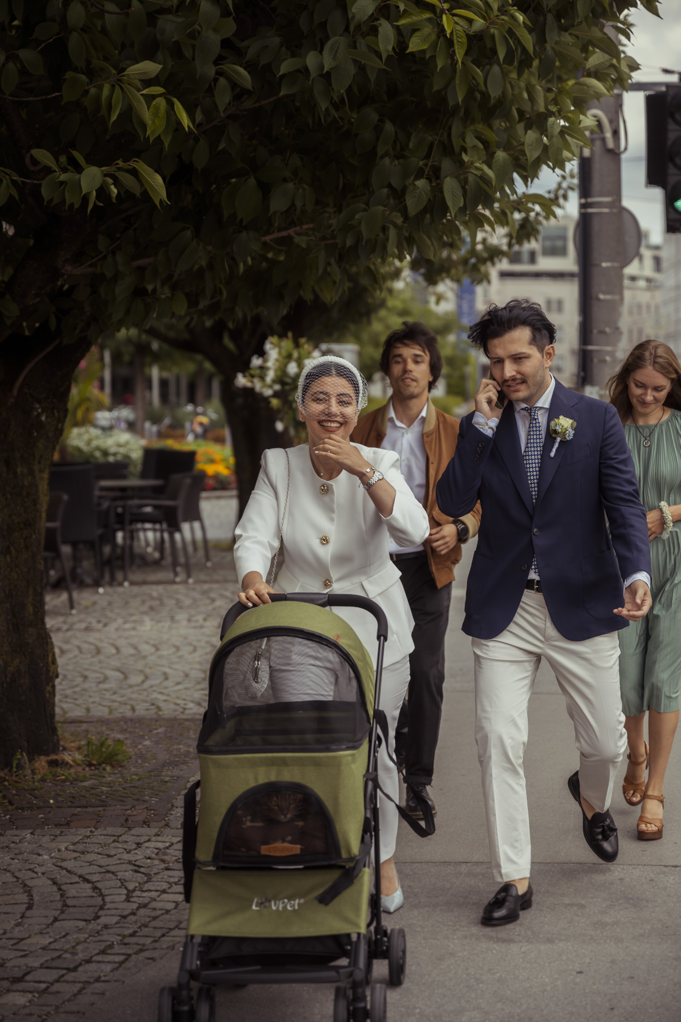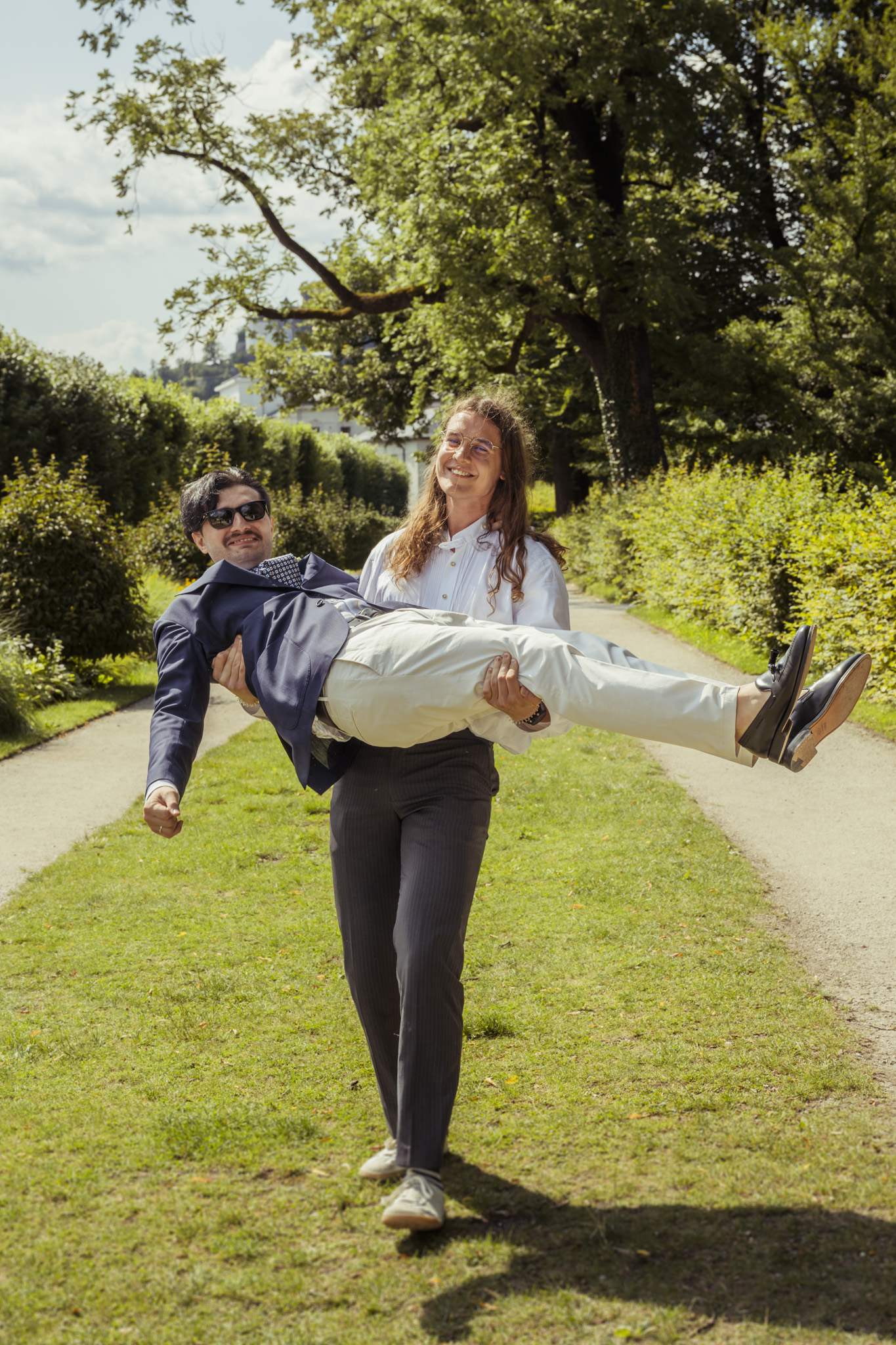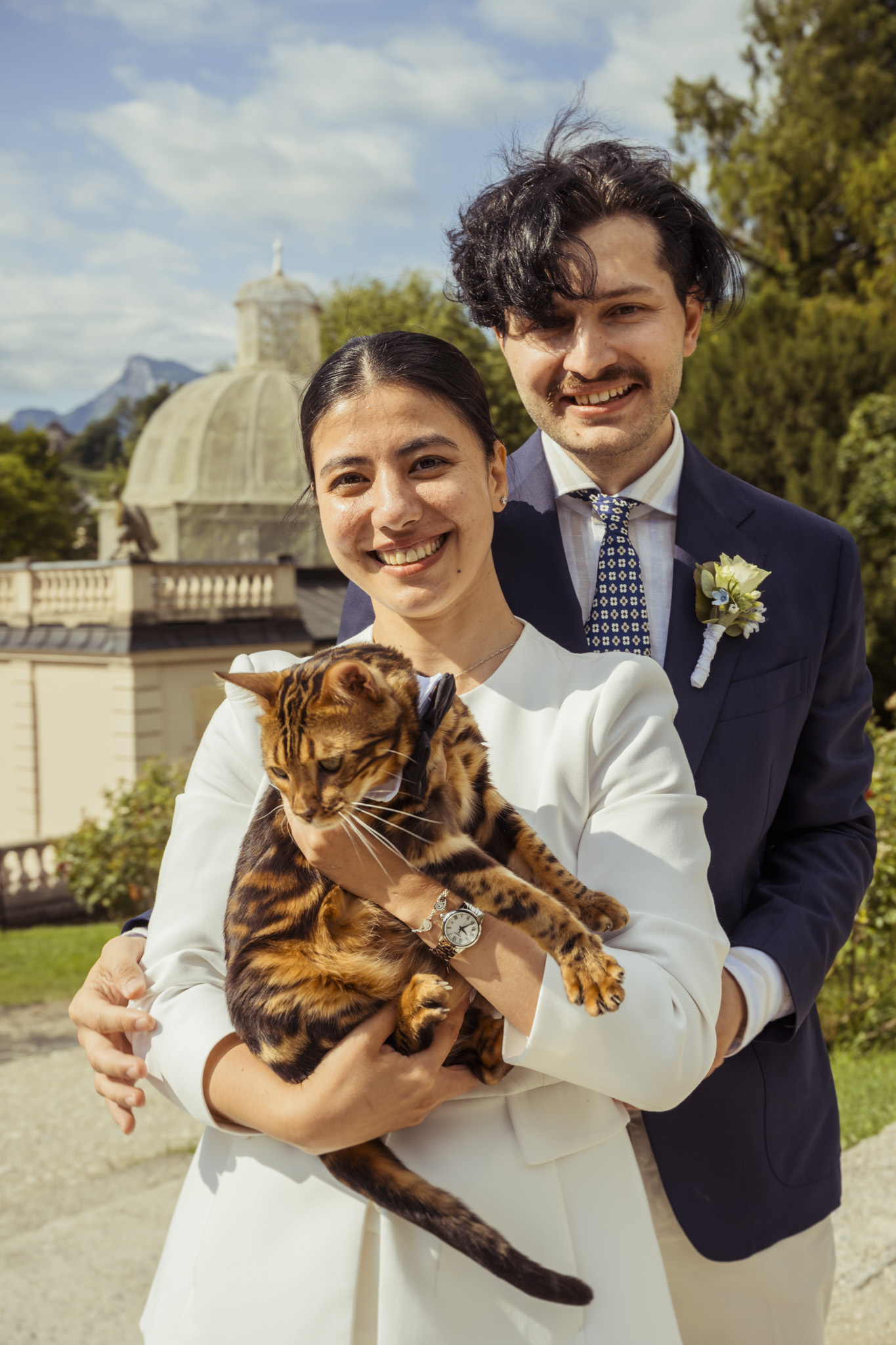 Nach der Zeremonie ging es hinaus in die Mirabellgärten, wo Salzburgs Sommer von seiner schönsten Seite strahlte. Zwischen Rosenbeeten und Arkaden entstanden lebendige, romantische und manchmal auch ganz spontane Bilder. Besonders einzigartig: Die Bengal-Katze der beiden war natürlich mit dabei – stilecht im Buggy chauffiert und mit Schleife am Halsband. Ein tierischer Hochzeitsgast, der alle zum Lachen brachte.