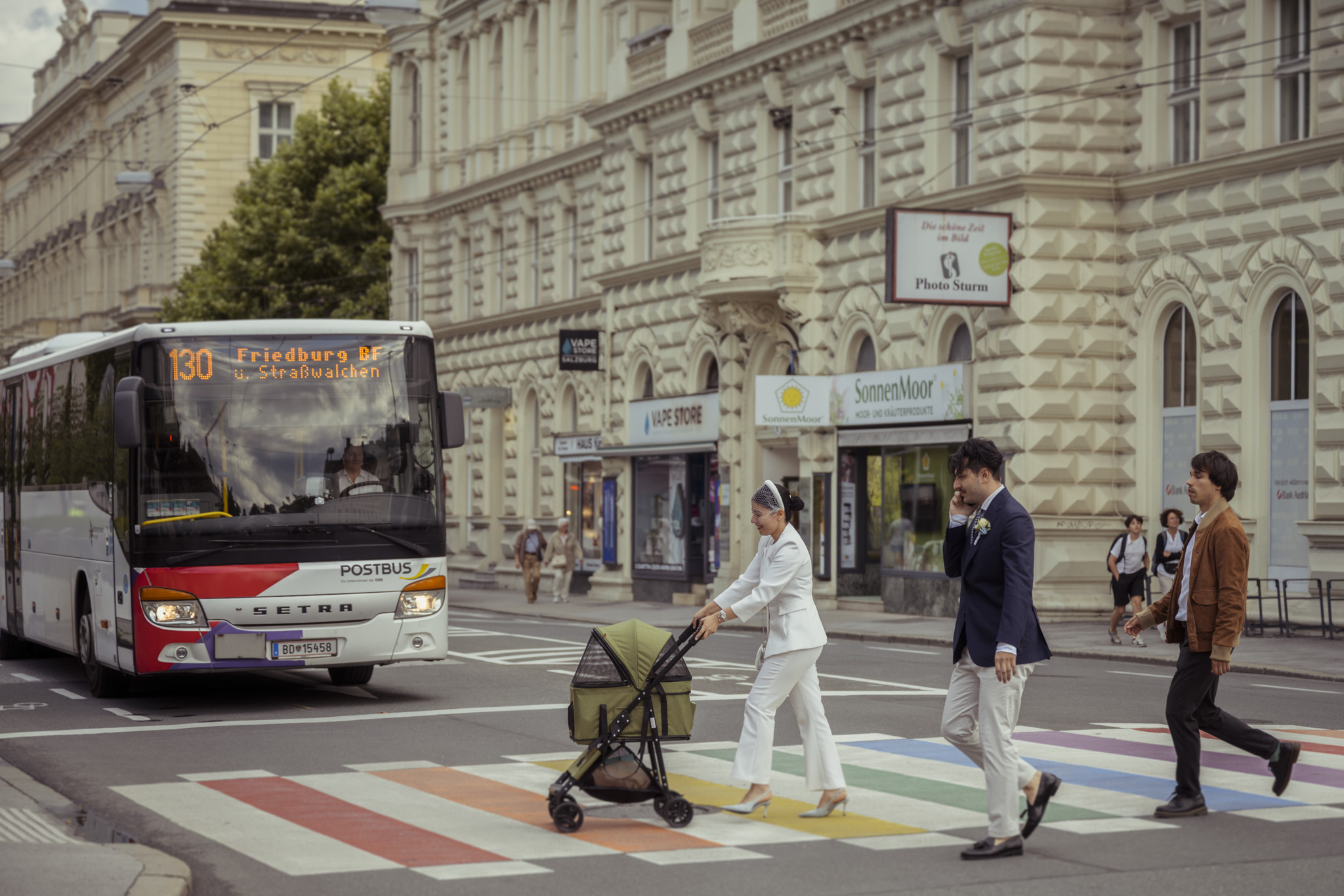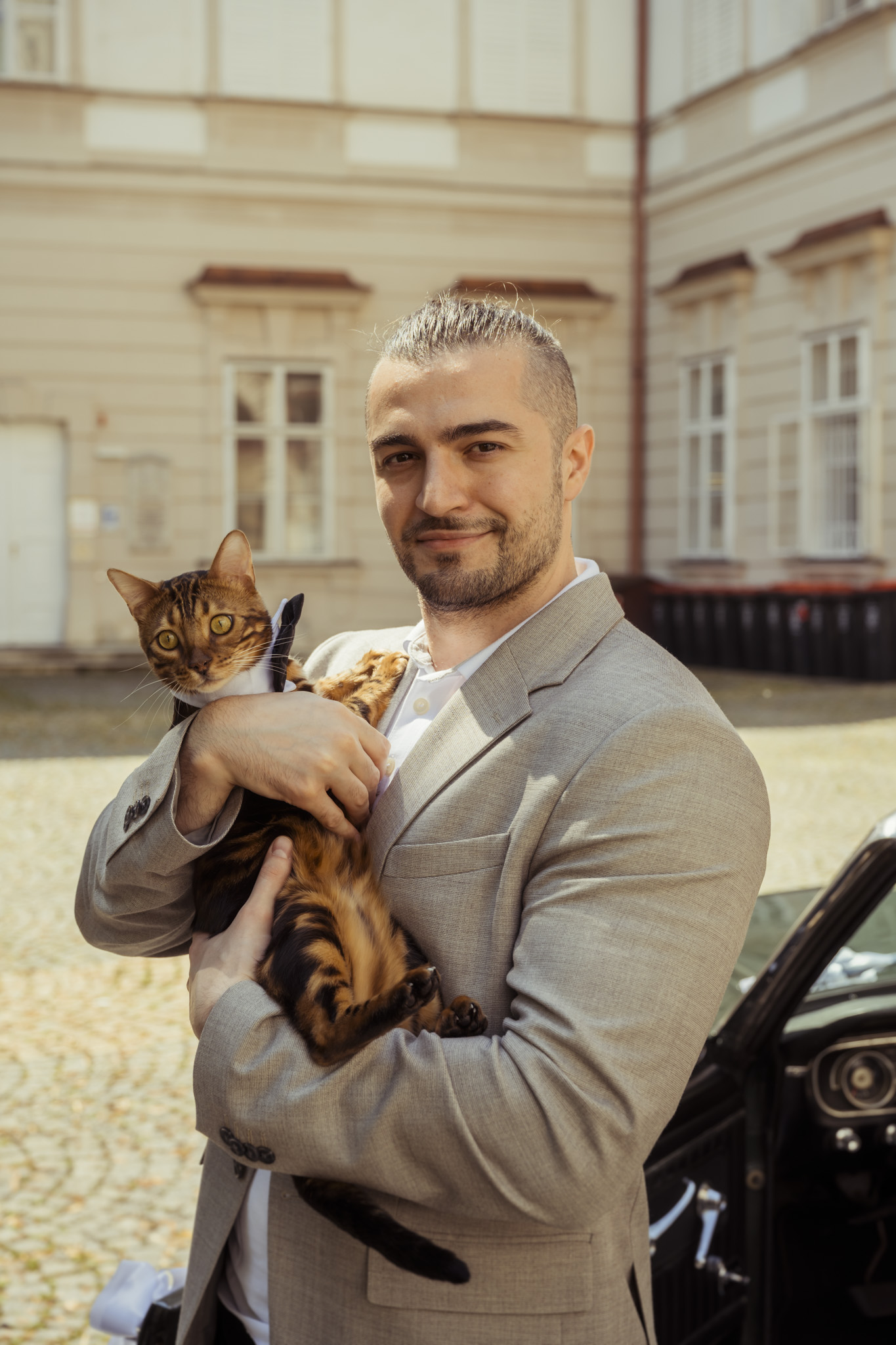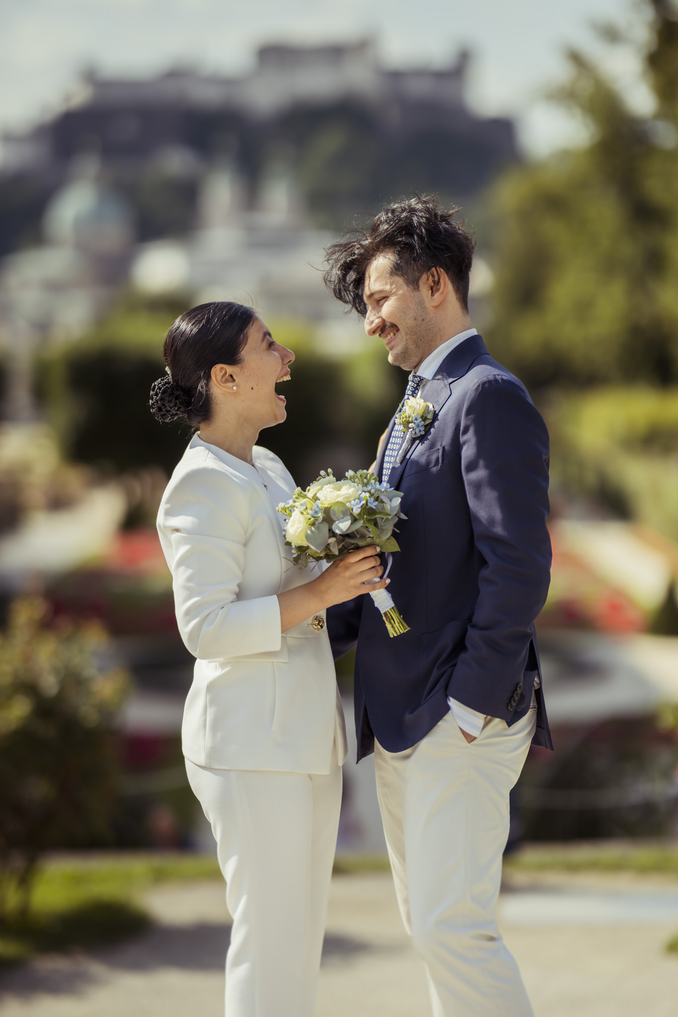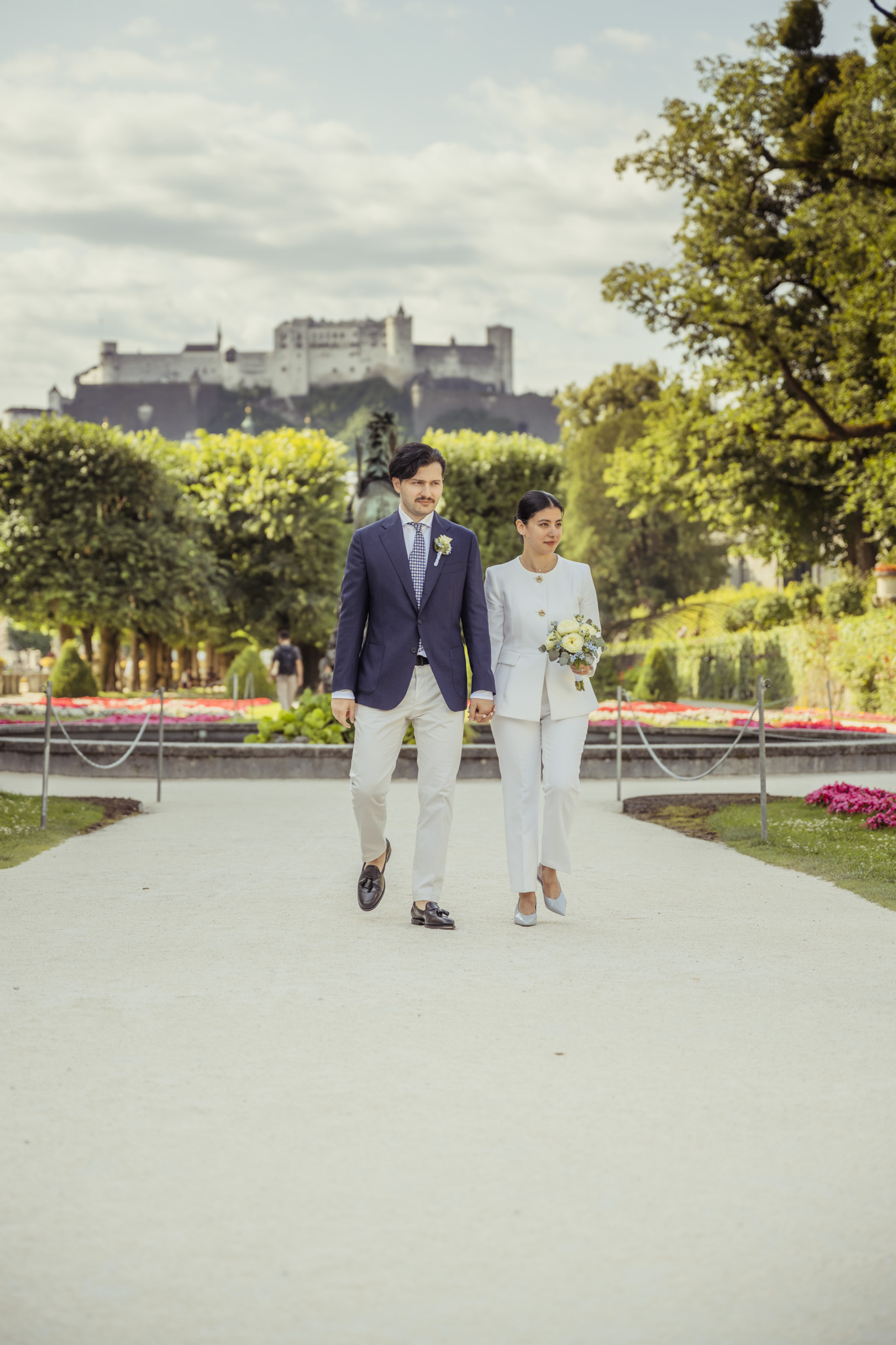 Nach der Zeremonie ging es hinaus in die Mirabellgärten, wo Salzburgs Sommer von seiner schönsten Seite strahlte. Zwischen Rosenbeeten und Arkaden entstanden lebendige, romantische und manchmal auch ganz spontane Bilder. Besonders einzigartig: Die Bengal-Katze der beiden war natürlich mit dabei – stilecht im Buggy chauffiert und mit Schleife am Halsband. Ein tierischer Hochzeitsgast, der alle zum Lachen brachte.