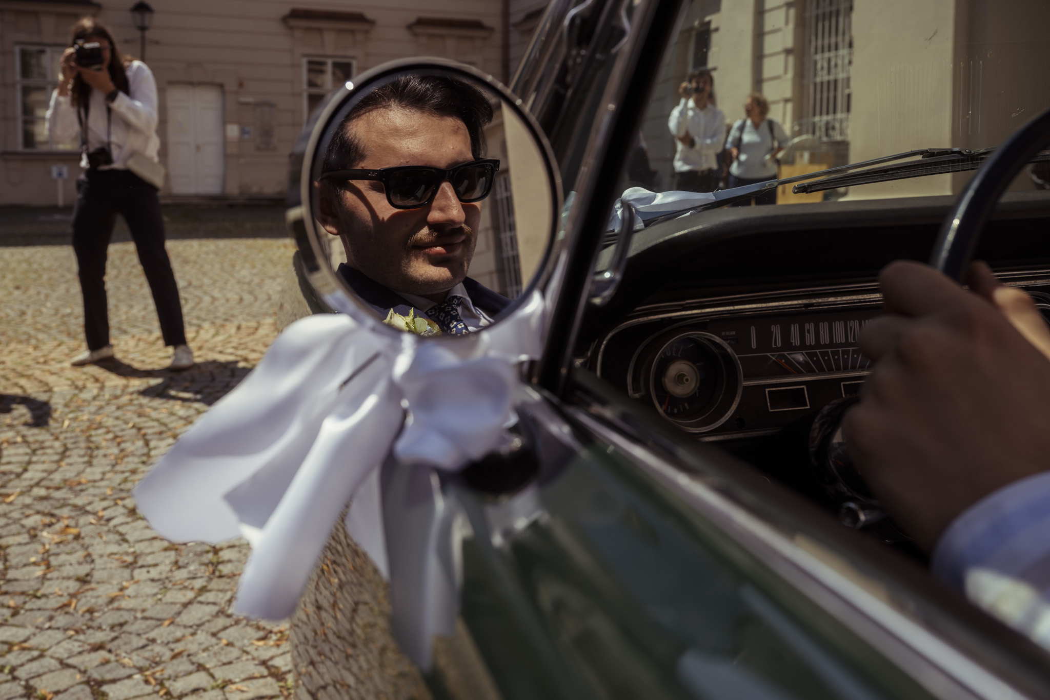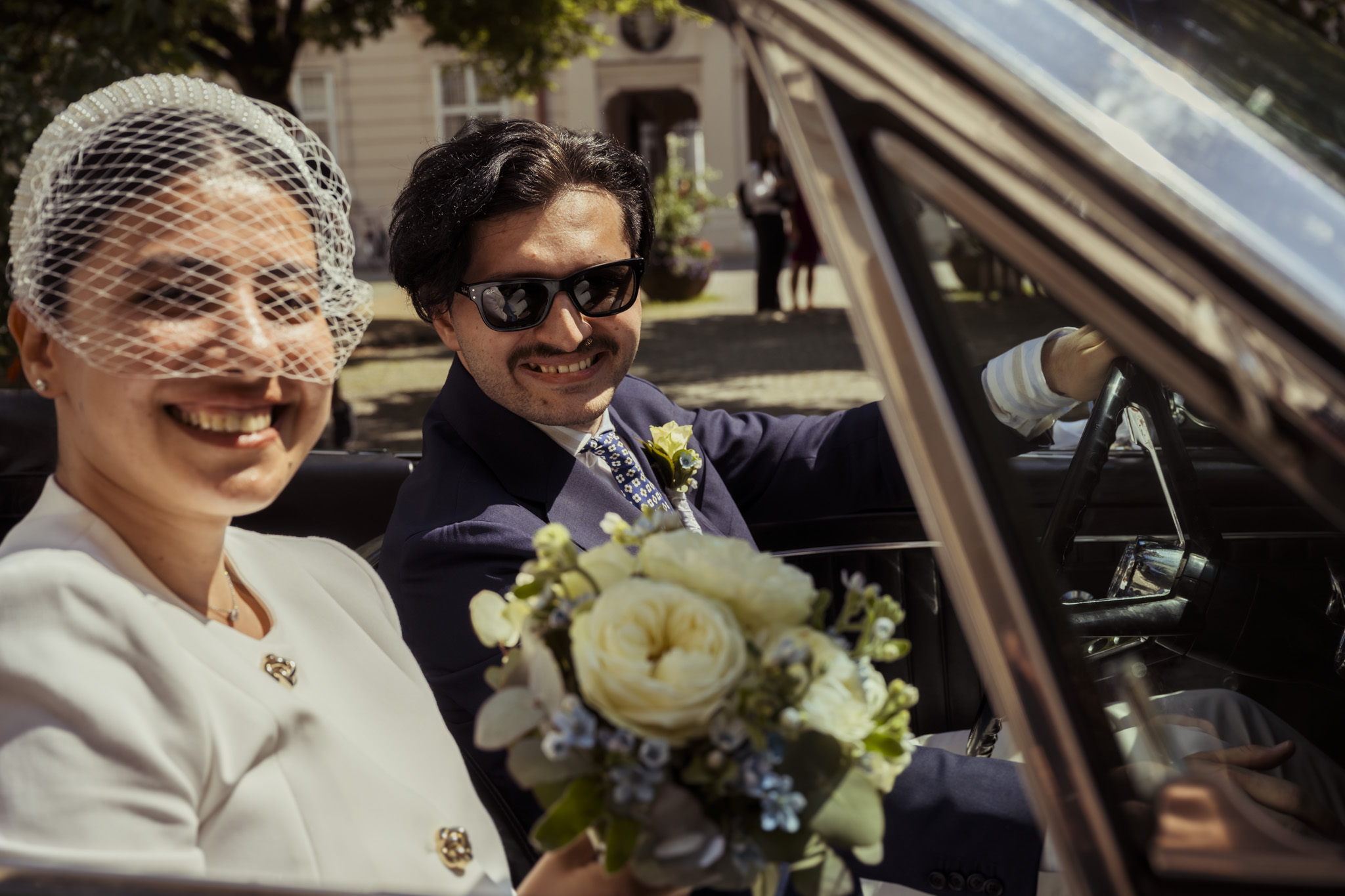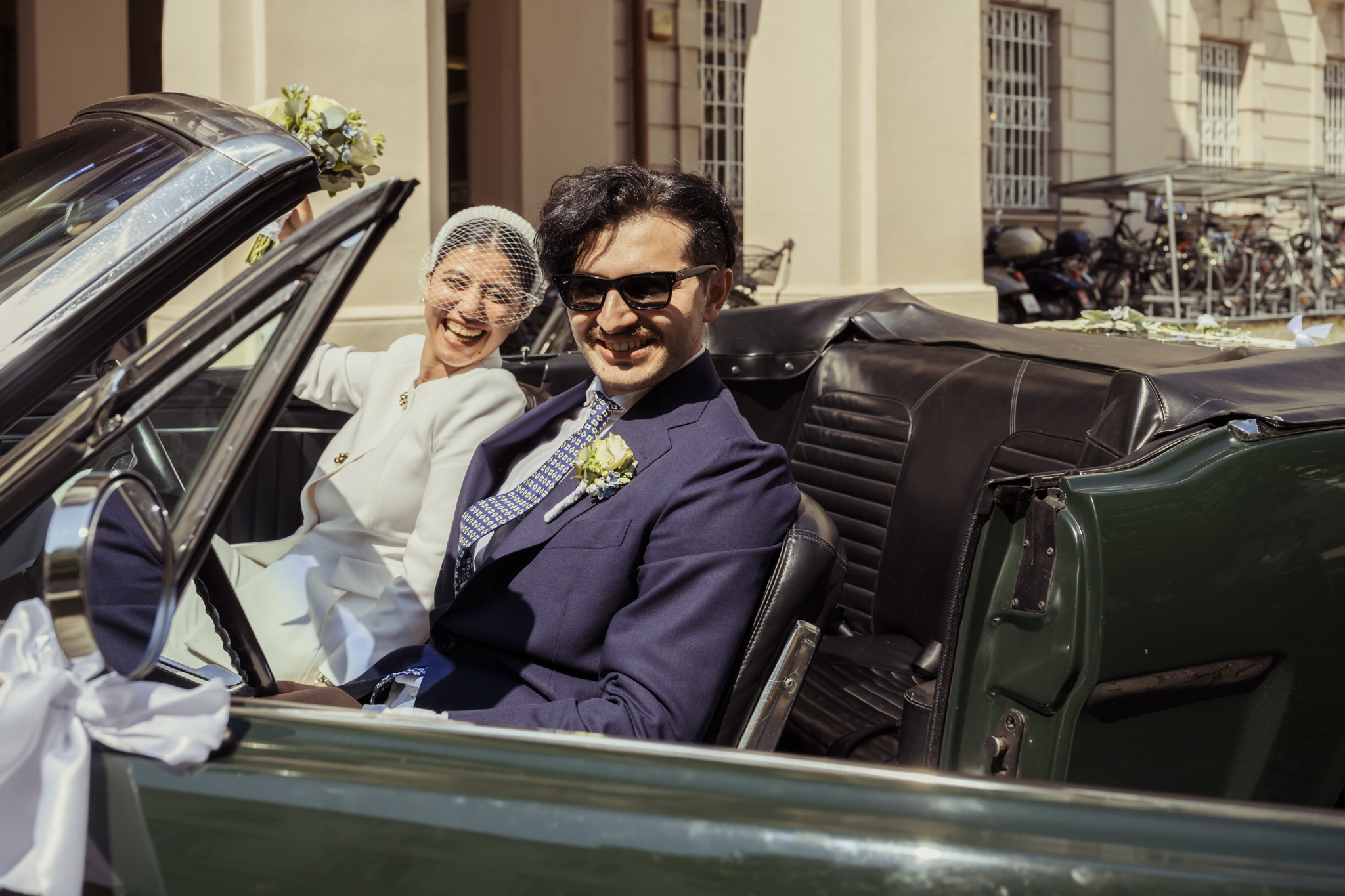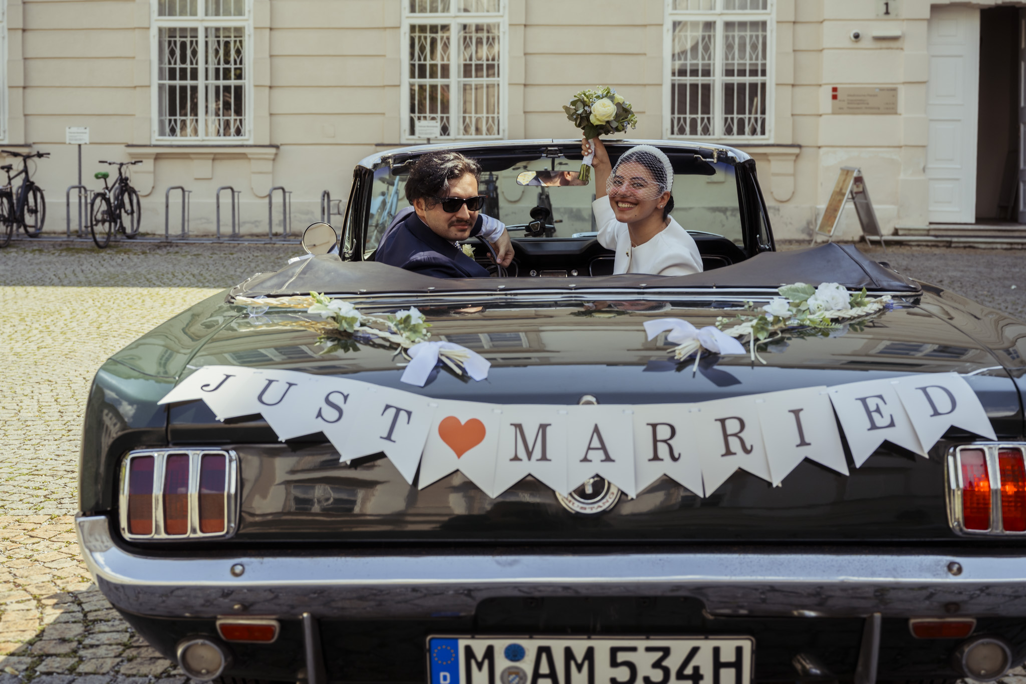 Ein weiteres Highlight des Tages: die Fahrt im Grünen Ford Mustang Cabrio. Mit Sonnenbrille, Brautstrauß in der Luft und einem „Just Married“-Schild am Heck verwandelten die beiden Salzburg kurzerhand in ein kleines Hollywood. Die Fahrt durch die Stadt war nicht nur ein echter Hingucker, sondern spiegelte auch perfekt ihre Persönlichkeit wider – modern, individuell und ein bisschen unkonventionell.